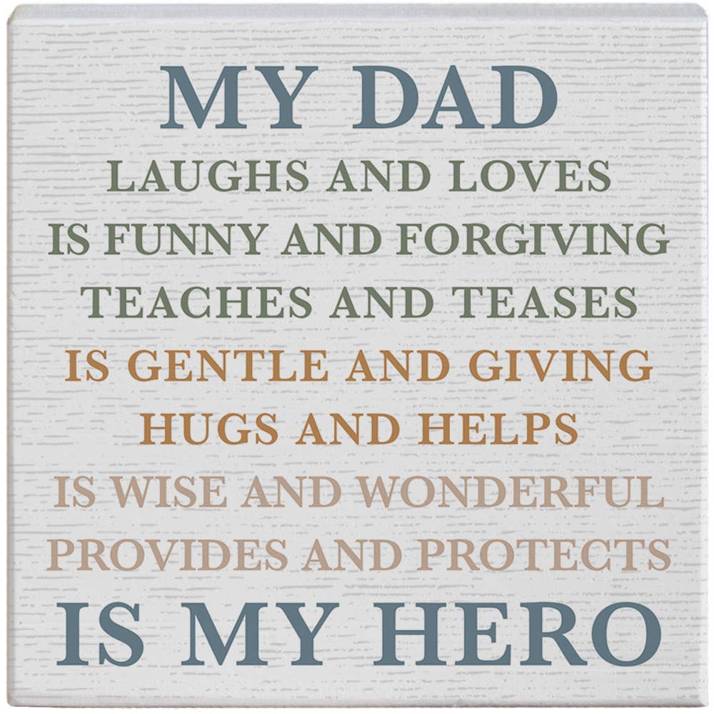 "MY DAD LAUGHS AND LOVES IS FUNNY AND FORGIVING TEACHES AND TEASES IS GENTLE AND GIVING HUGS AND HELPS IS WISE AND WONDERFUL PROVIDES AND PROTECTS IS MY HERO"