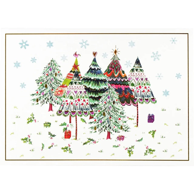 Vibrant greeting cards feature a snowy copse of colorfully decorated Christmas trees, surrounded by boughs of holly.