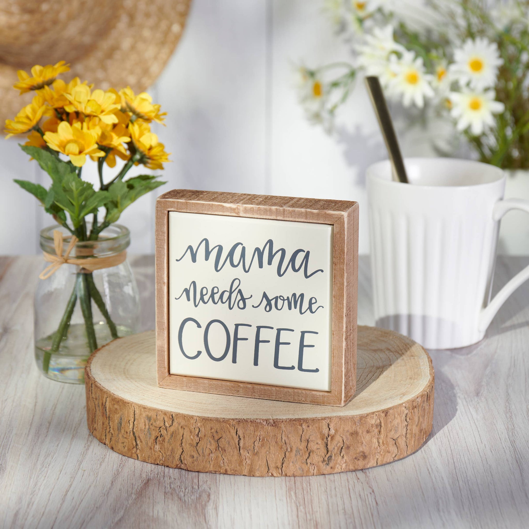 A small wooden box sign from our Mother's Day Collection displaying a humorous mom-themed sentiment in a unique hand illustrated style that reads "Mama Needs Some Coffee." Box sign features a natural wood frame and faux enamel finish behind design for a tile-like appearance. Our Mama Needs Some Coffee box sign mini is easy to hang or can free-stand alone. A fun gift perfect for Mother's Day or as an everyday home accent that can easily blend into any display.