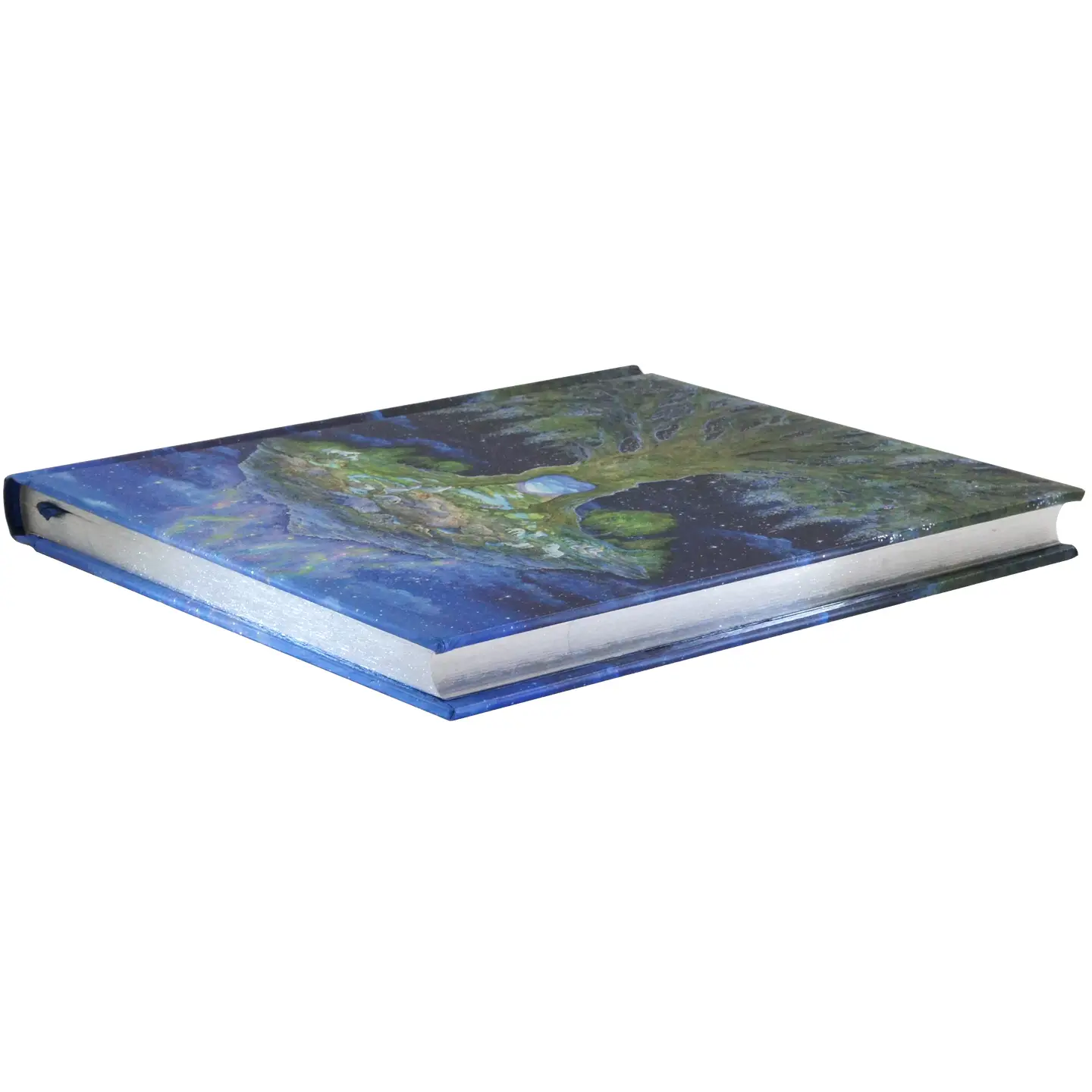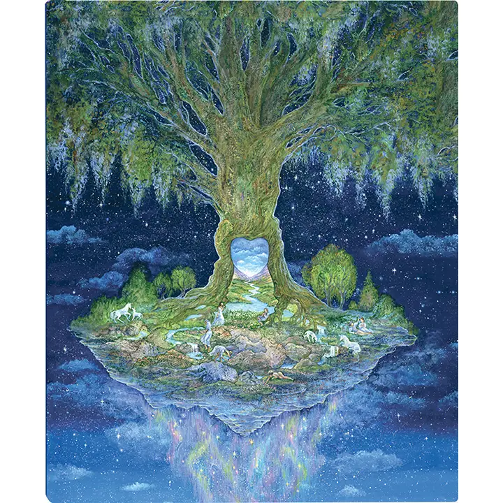 The cover of this dreamlike journal depicts a world tree afloat in a star-filled universe, with fairy folk and unicorns at its base. A heart-shaped portal within the tree's trunk opens into another world.