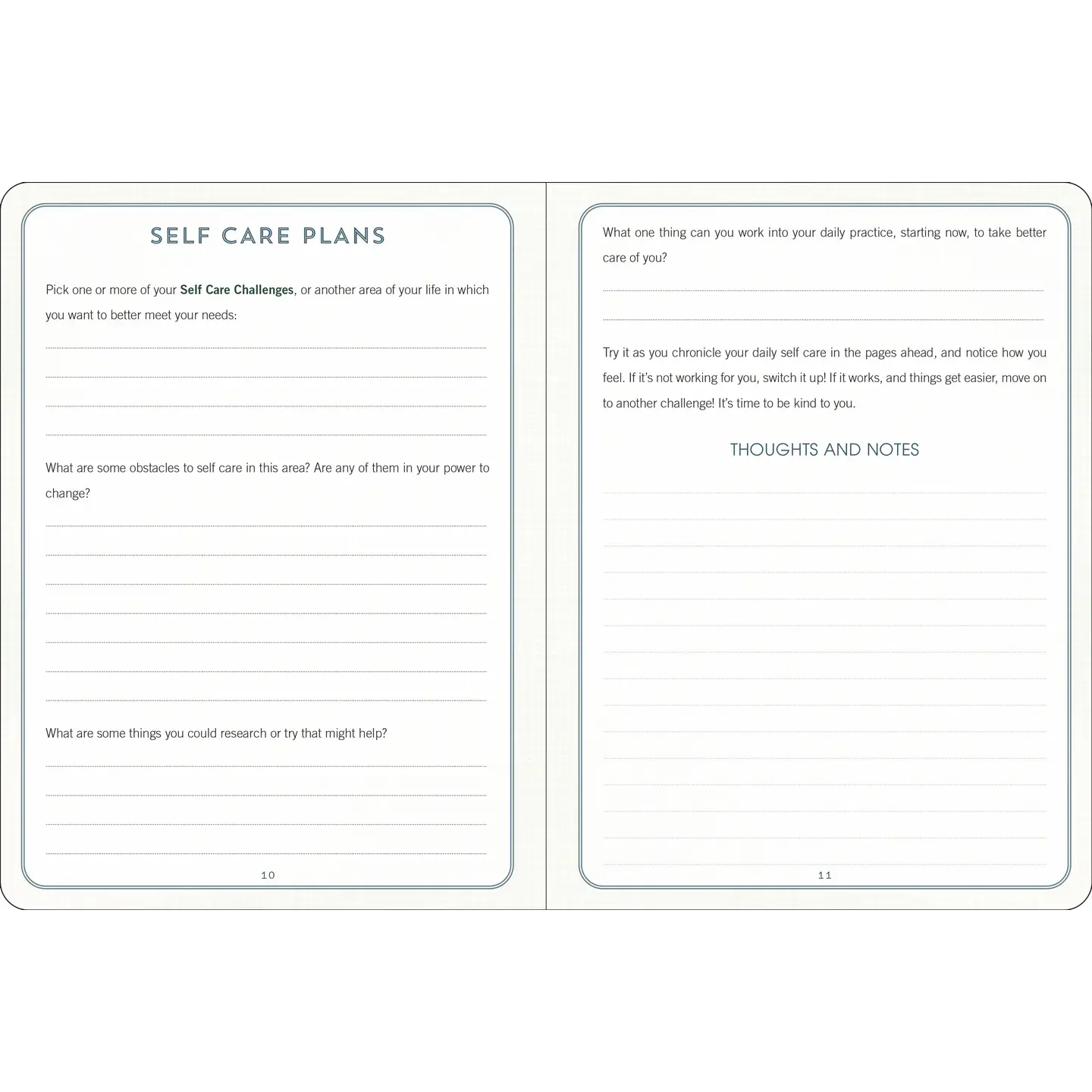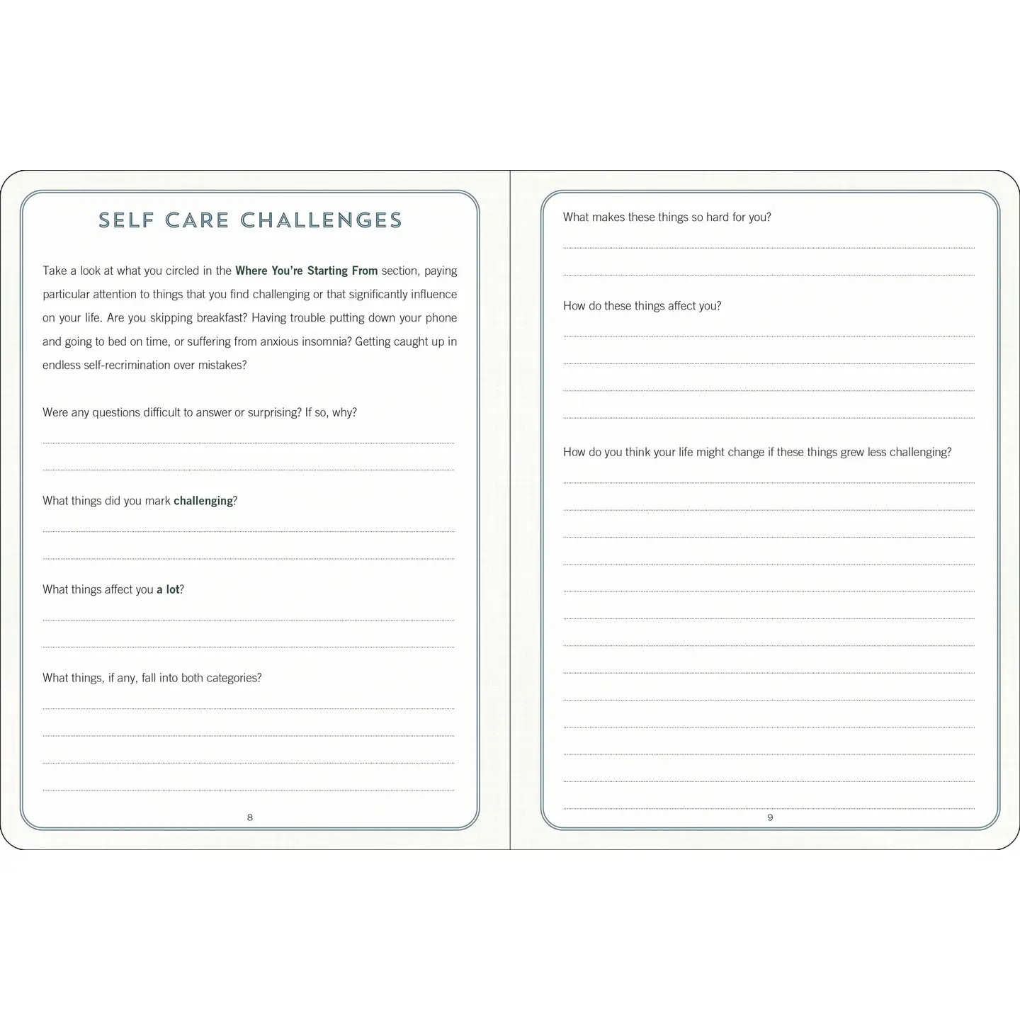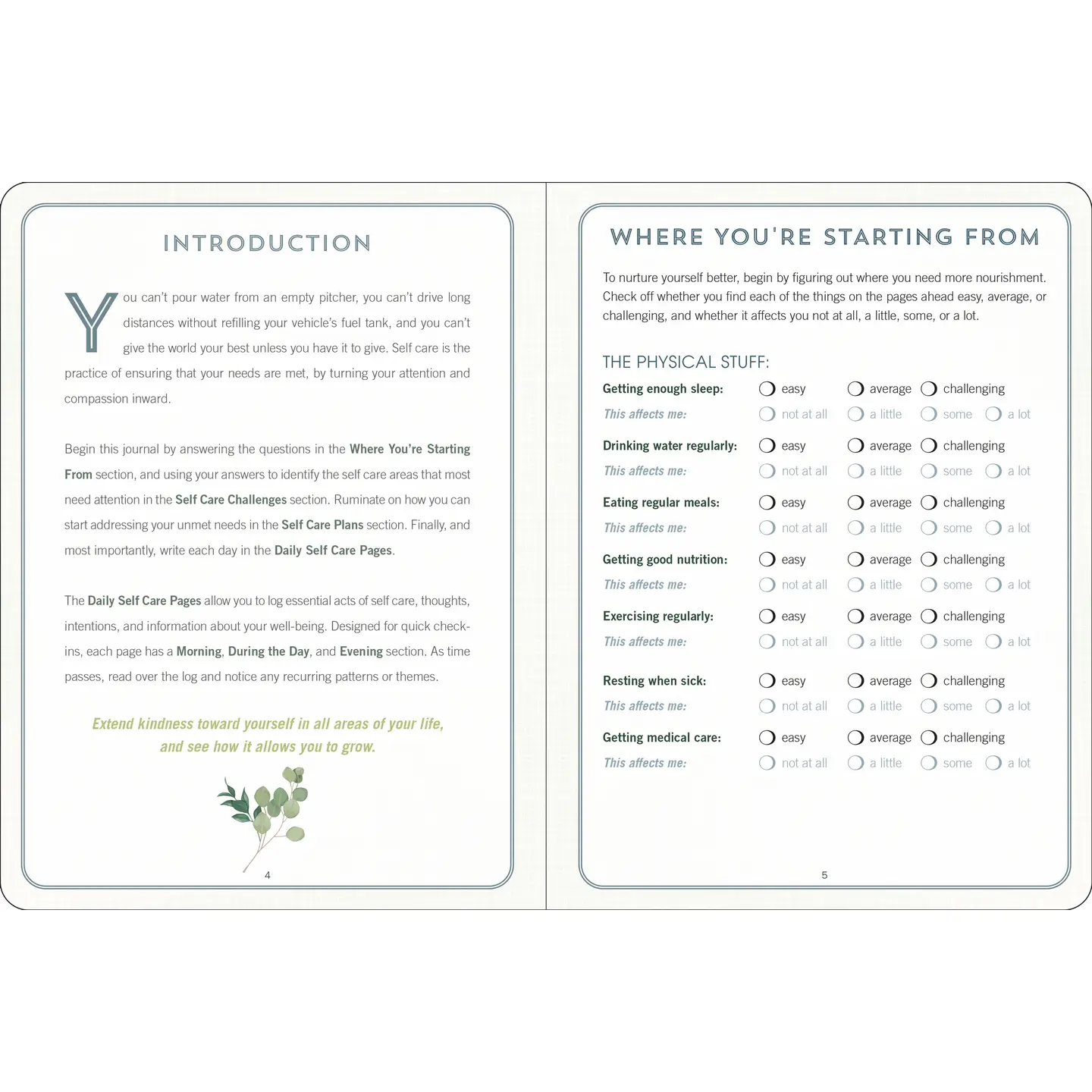 - Contents include: Introduction, Where You're Starting From (The Physical Stuff, the Mental Stuff, the Interpersonal Stuff), Self-Care Challenges, Self-Care Plans, and Daily Self-Care Pages.
