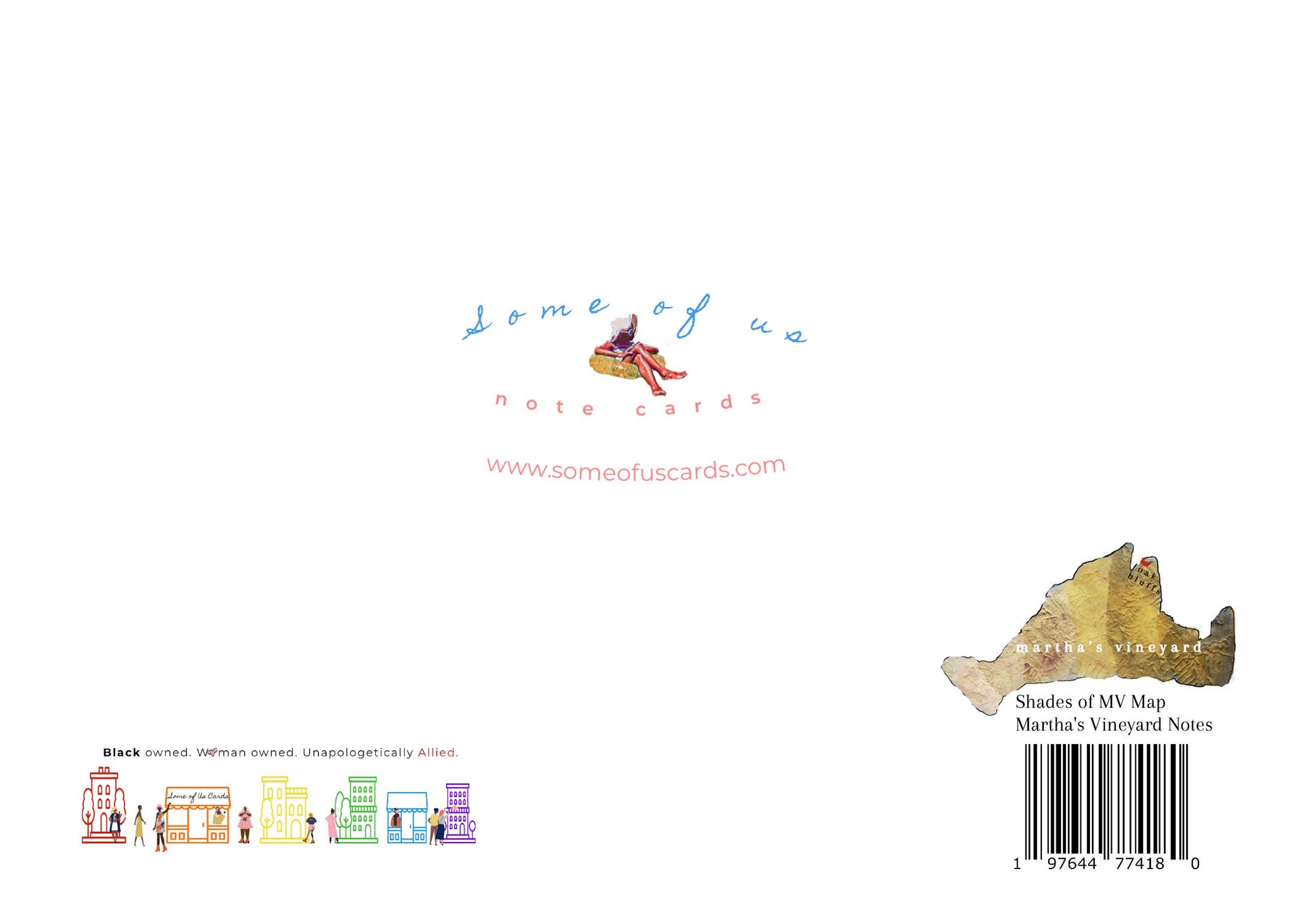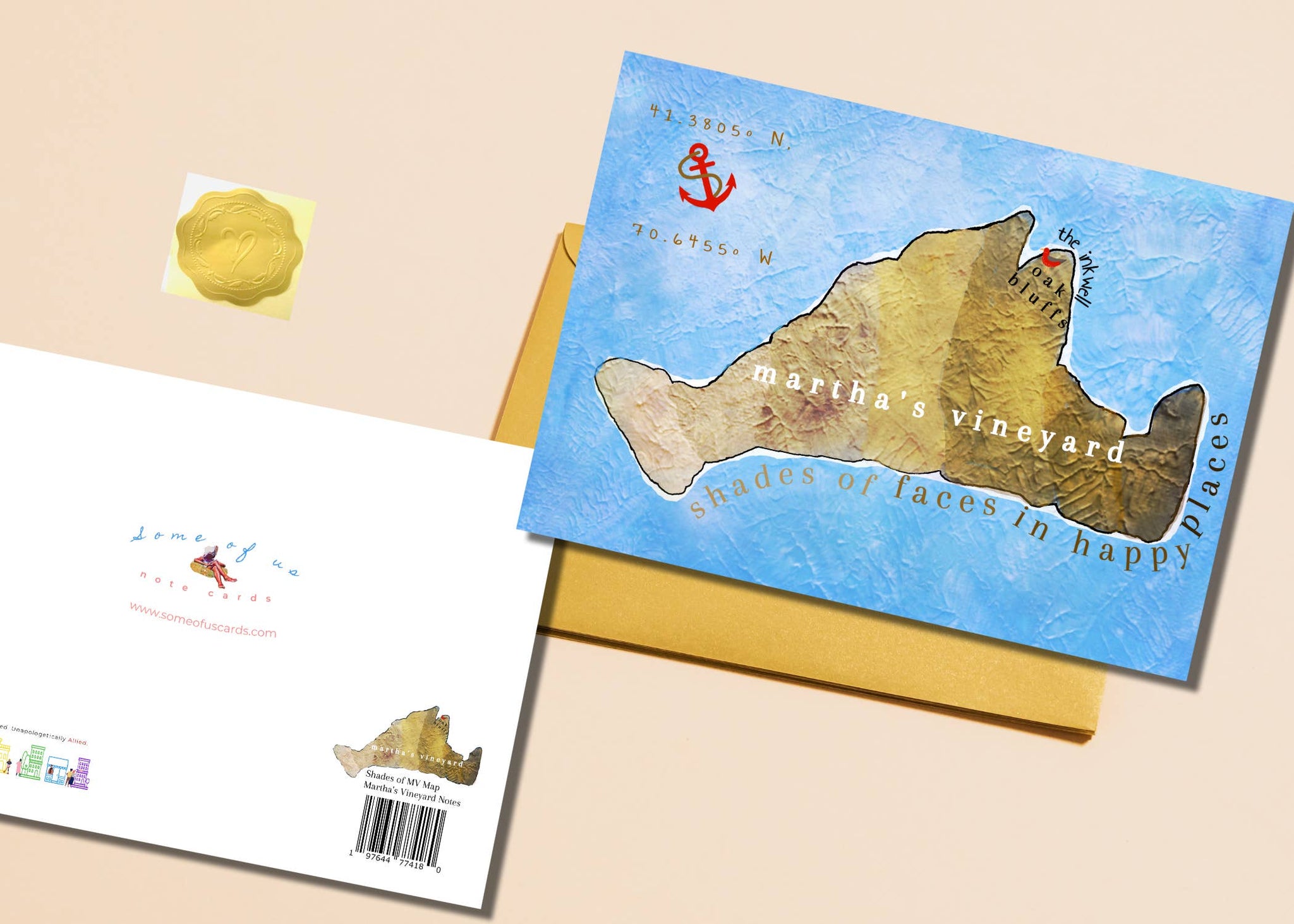 - Blue card with shades of brown in the shape of Martha's Vineyard.