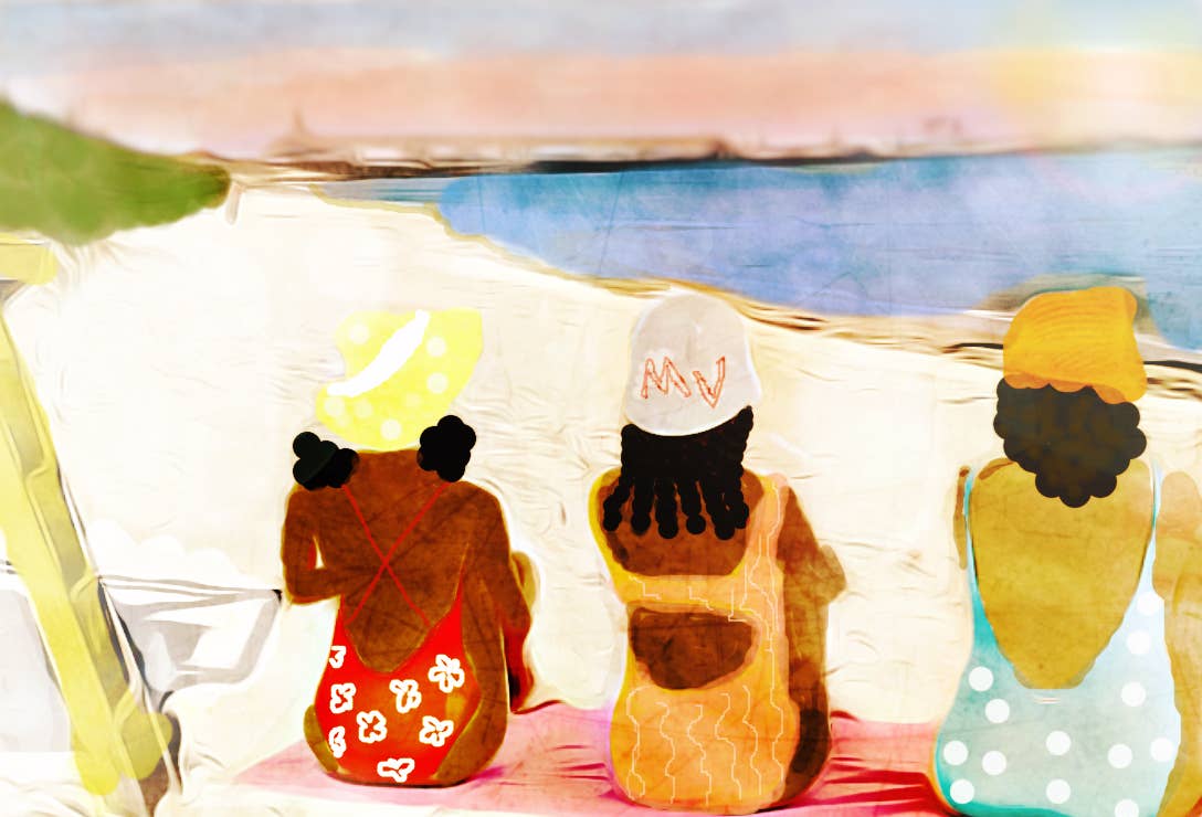 - Brushed, vibrant image of three women at Martha's Vineyard's famous Inkwell.