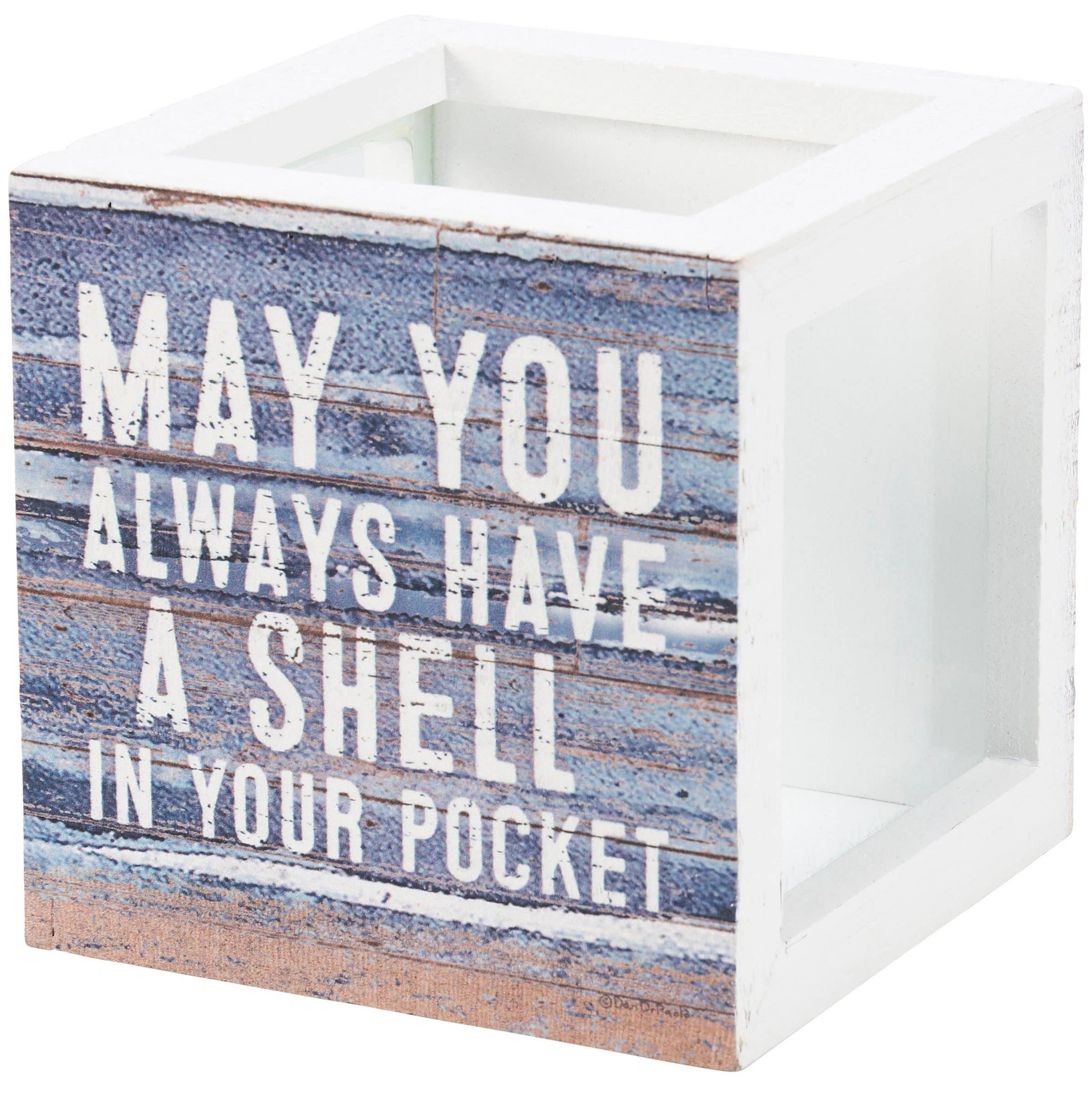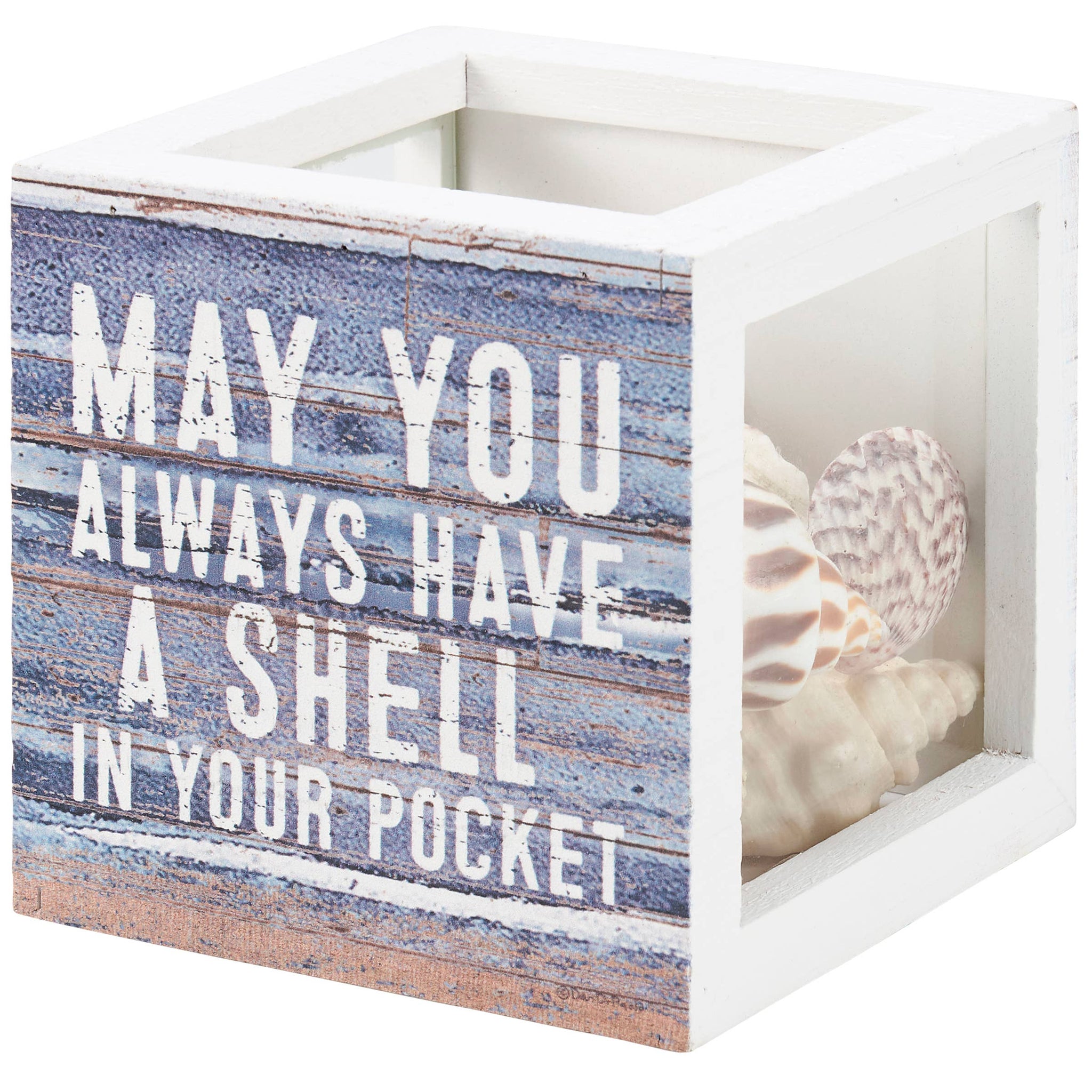 A double-sided wooden seashell holder from our Beach Collection with a rustic beach inspired design on each side. Design displays inspirational beach-themed sentiment that reads "May You Always Have A Shell In Your Pocket." Wood frame features a coordinating white color with distressed details. Our In Your Pocket shell holder includes side panel glass windows to view keepsakes and a top opening to drop items in. A rustic beach-themed gift to display keepsakes as everyday home décor.