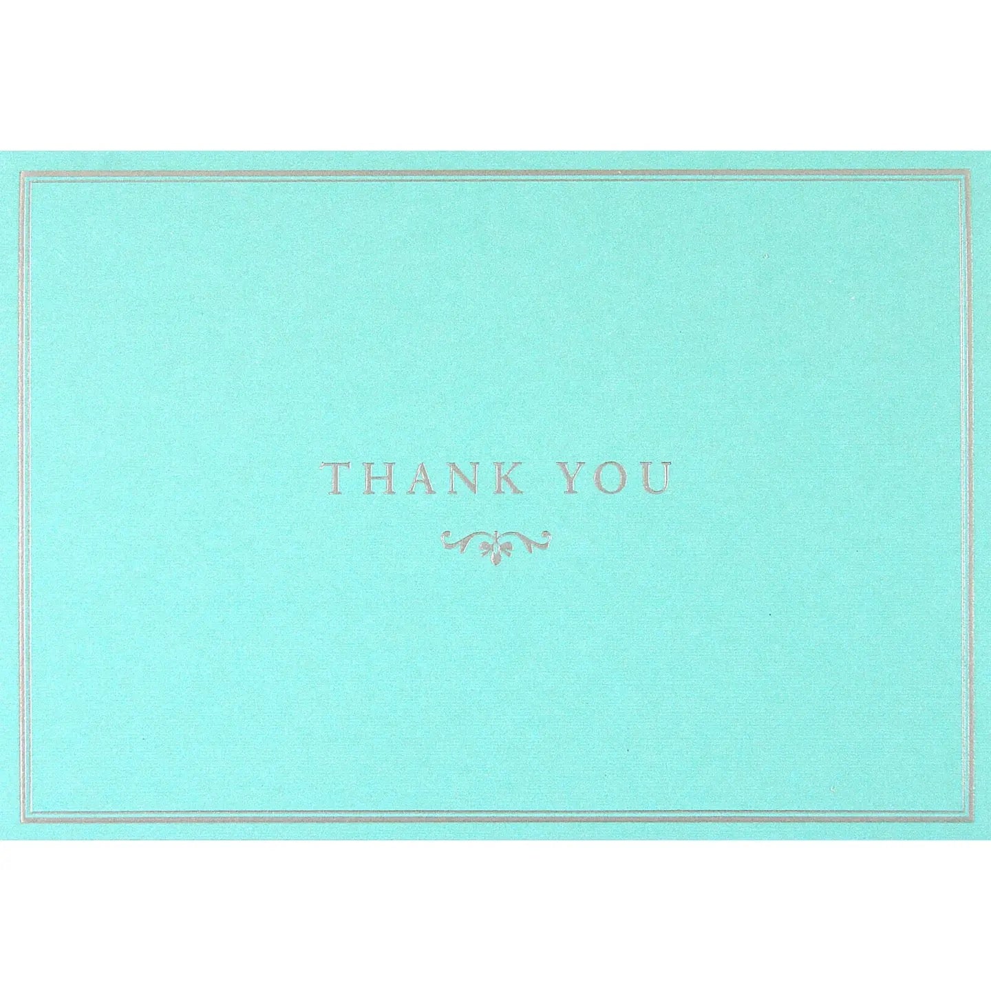 - The words "Thank You" and the decorative flourish below are embossed in silver foil.
