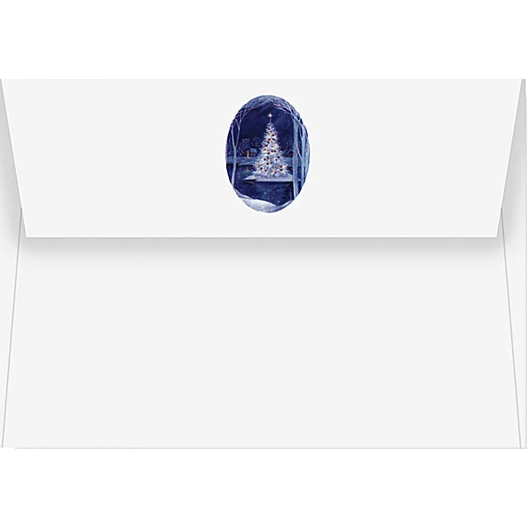 An island Christmas tree aglow is reflected in surrounding waters and framed by arching branches on these lovely little greeting cards.
