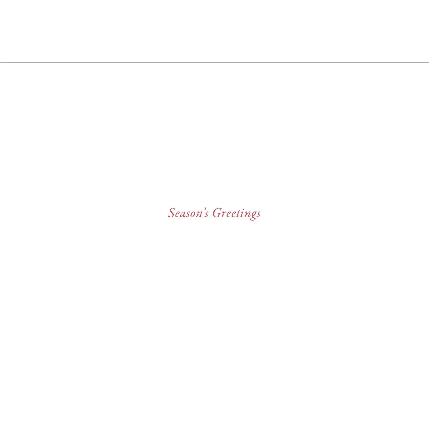 Vibrant greeting cards feature a snowy copse of colorfully decorated Christmas trees, surrounded by boughs of holly.