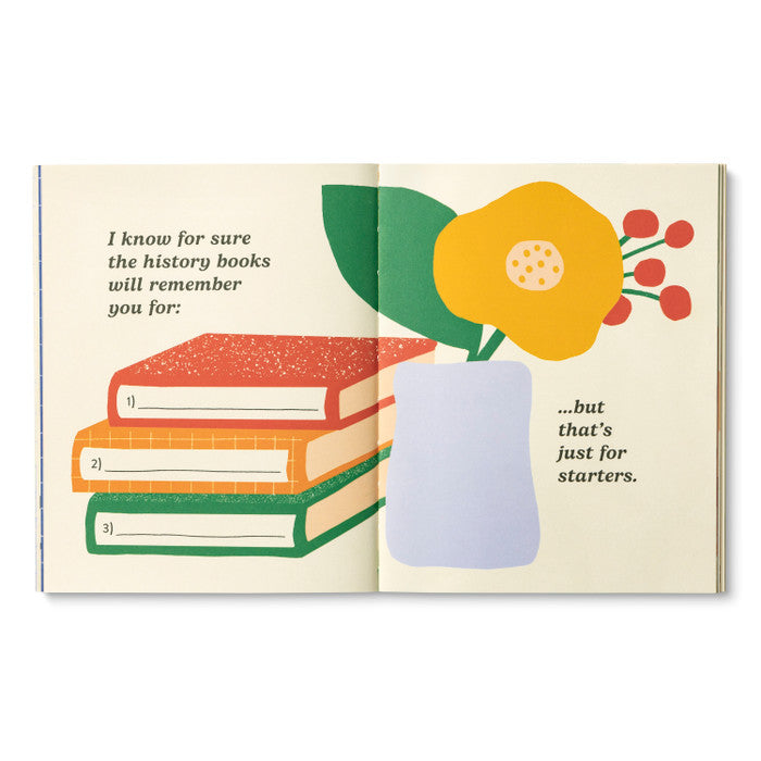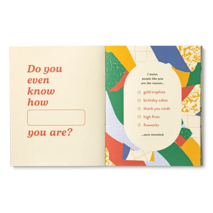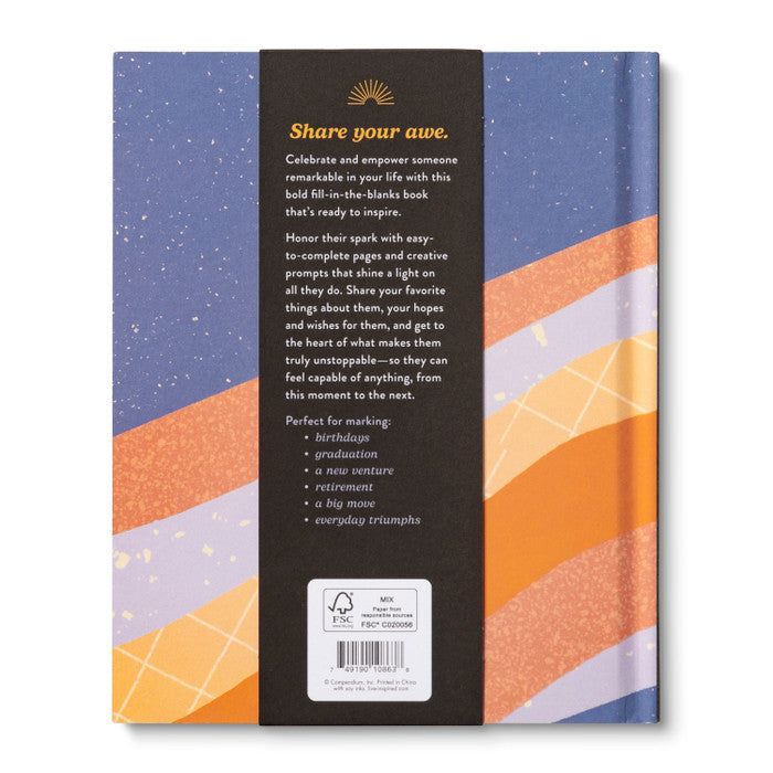 Share your awe-inspiring tribute to someone in your life who is simply remarkable. This vibrant fill-in-the-blanks gift book will help you honor their spark and shine a light on all that they do. Personalize the easy-to-complete pages by filling in your favorite things about them, your hopes and wishes for them, and all that makes them truly unstoppable. In less than an afternoon, you can create a completely unique keepsake, perfect for celebrating a birthday, graduation, new venture, retirement, big move, or an everyday triumph.